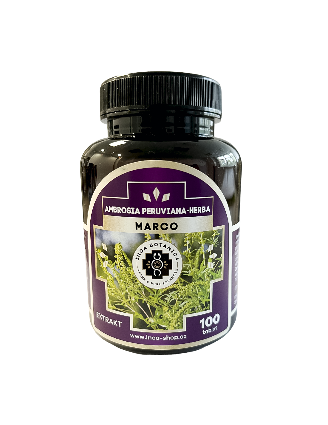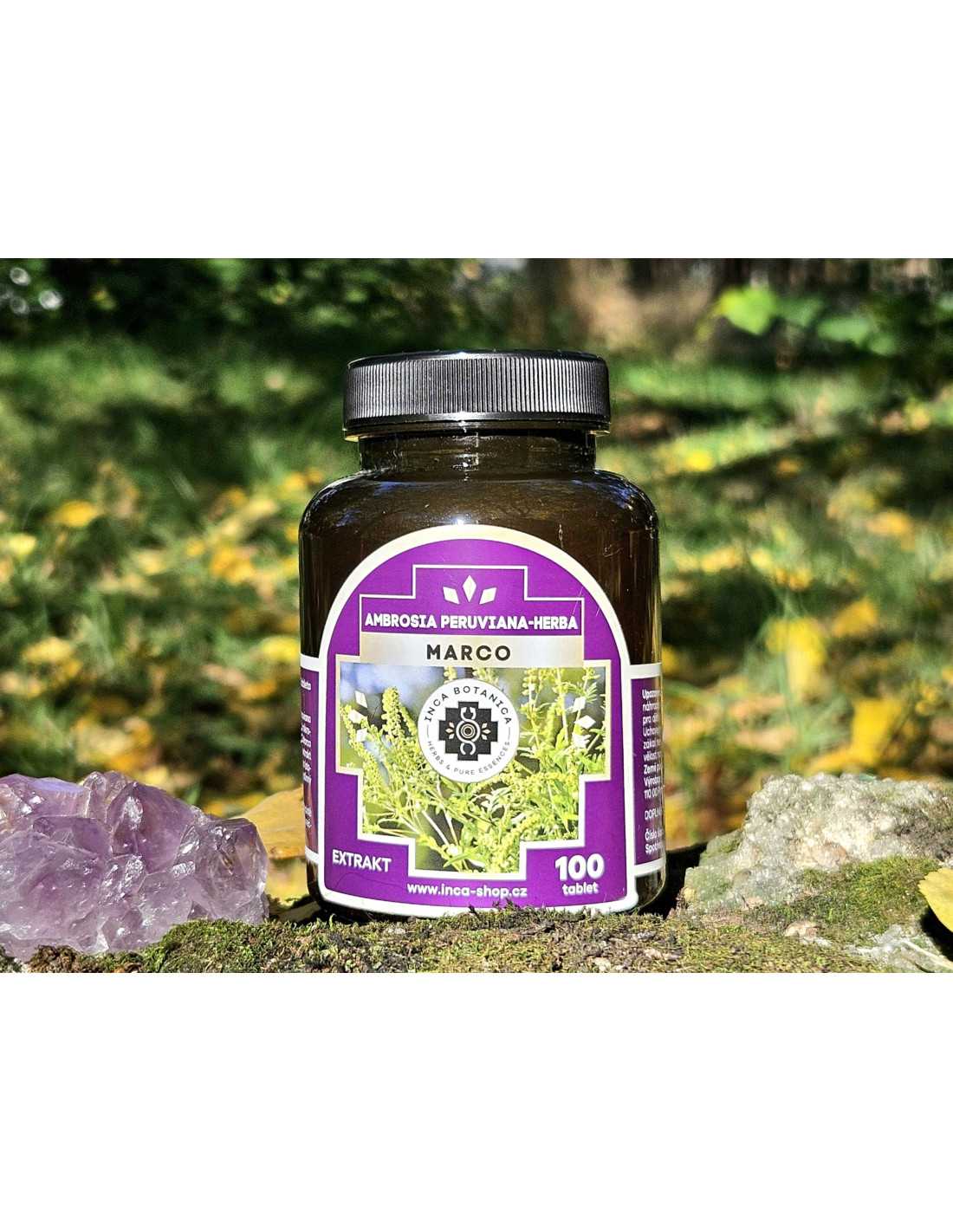 Zloženie: 100% Marco (Ambrosia peruviana-hierba). 1 tbl. 600 mg obsahuje mikrokryštalická celulóza (plnidlo), Marco (Ambrosia peruviana-hierba) extrakt 160 mg, Hydroxypropylmetylcelulóza (stabilizátor), Stearan horečnatý rastlinný (protispekavá látka)
